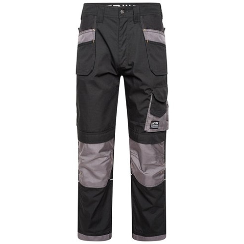 JCB Trade Plus Black/Grey Rip. 65% Polyester 35% Cotton Rip Stop Fabric 200gsm. Cordura reinforced holster pockets. Top loading Cordura knee pad pockets. Multifunctional pockets. Triple stitched flat felled seams. Cordura reinforcements at the bottom of both legs. Reflective piping on back of leg. Two back pockets.